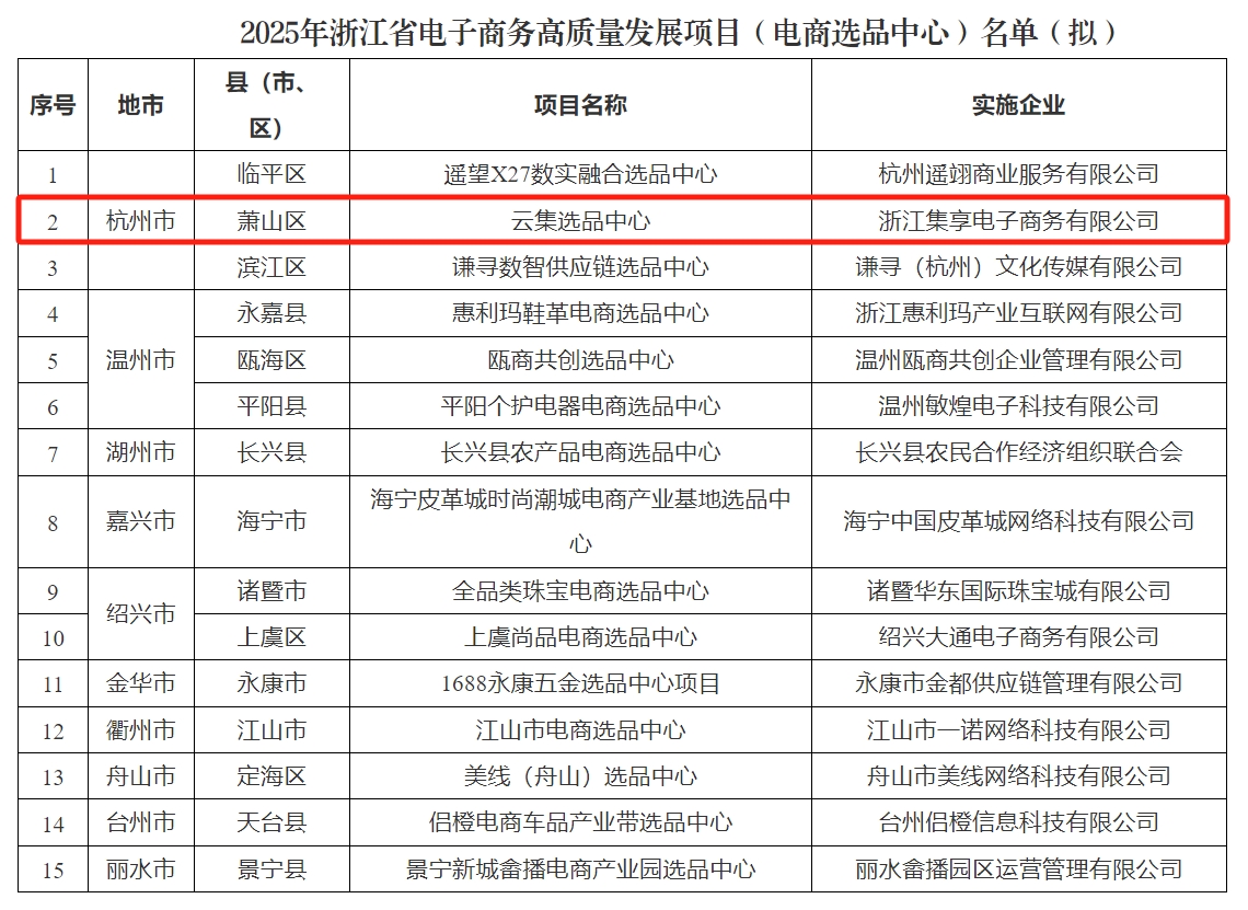 近日,2025年浙江省电子商务高质量发展项目名单公布,浙江集享电子商务有限公司“云集选品中心”项目入选2025年浙江省电子商务高质量发展项目(电商选品中心)。   ...